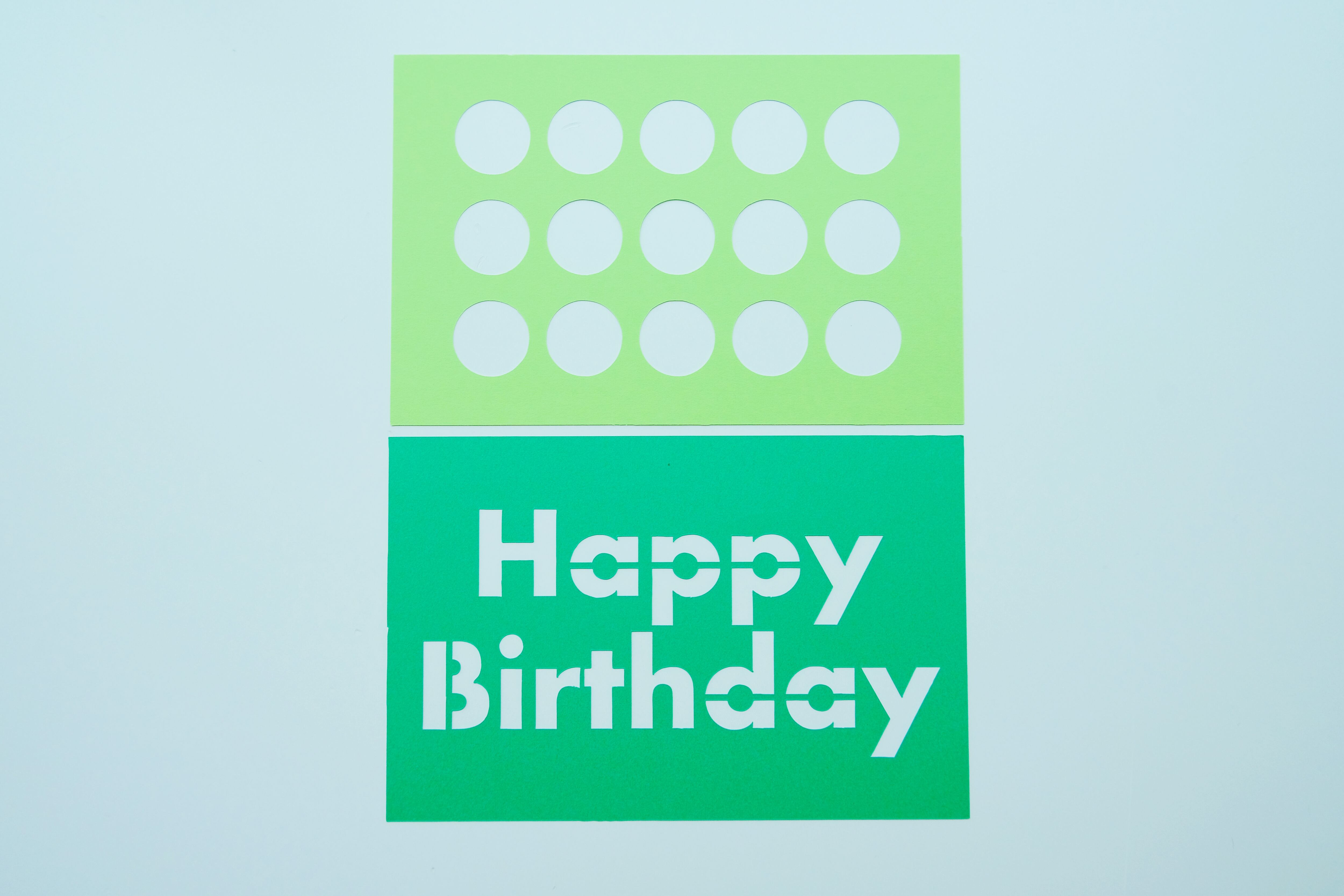 濃い緑色のHappy Birthdayのテキストと、黄緑色のドットがとてもハッピーです。