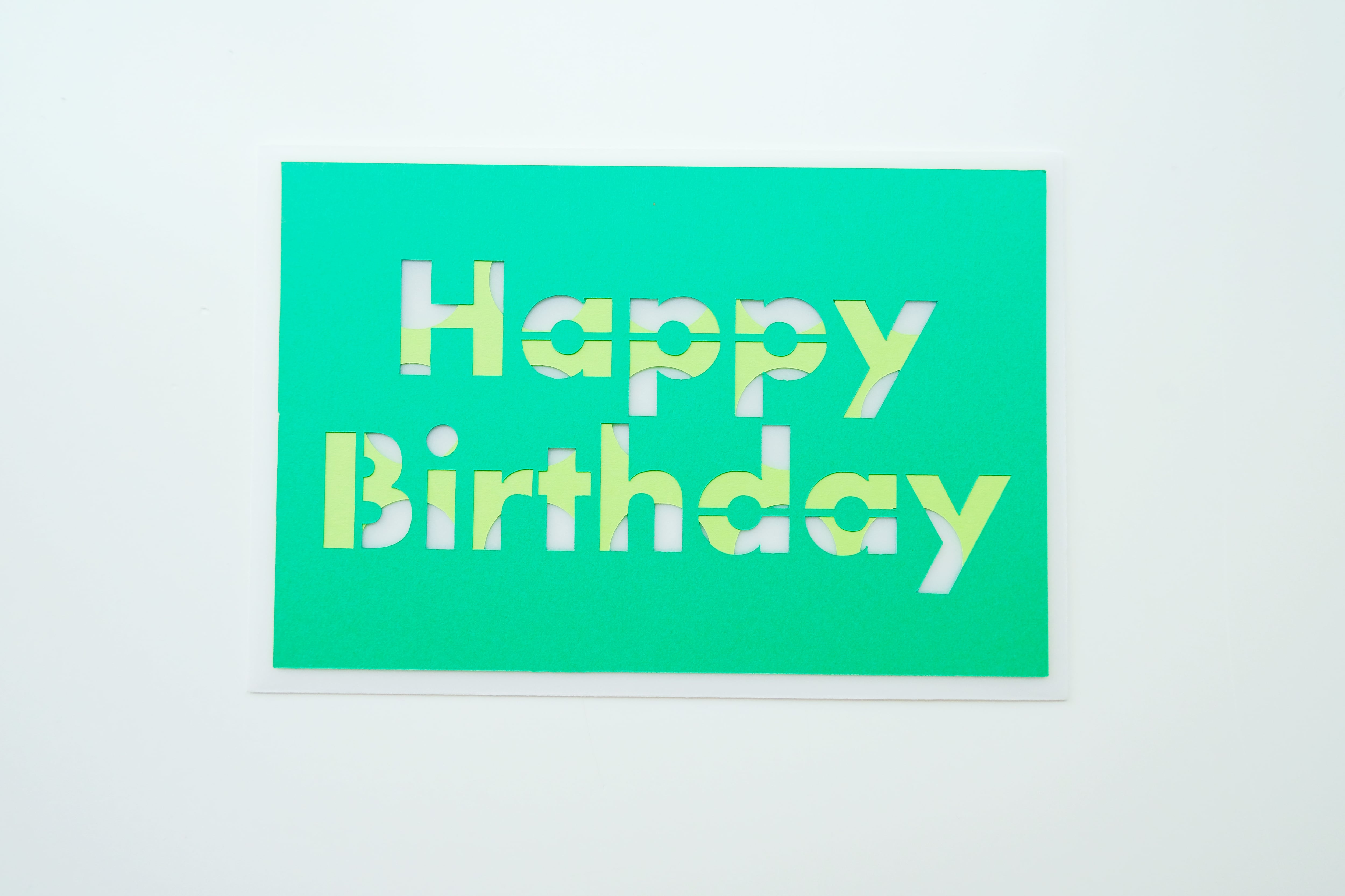 透け透け封筒の切り絵カード 緑色のHappy Birthday