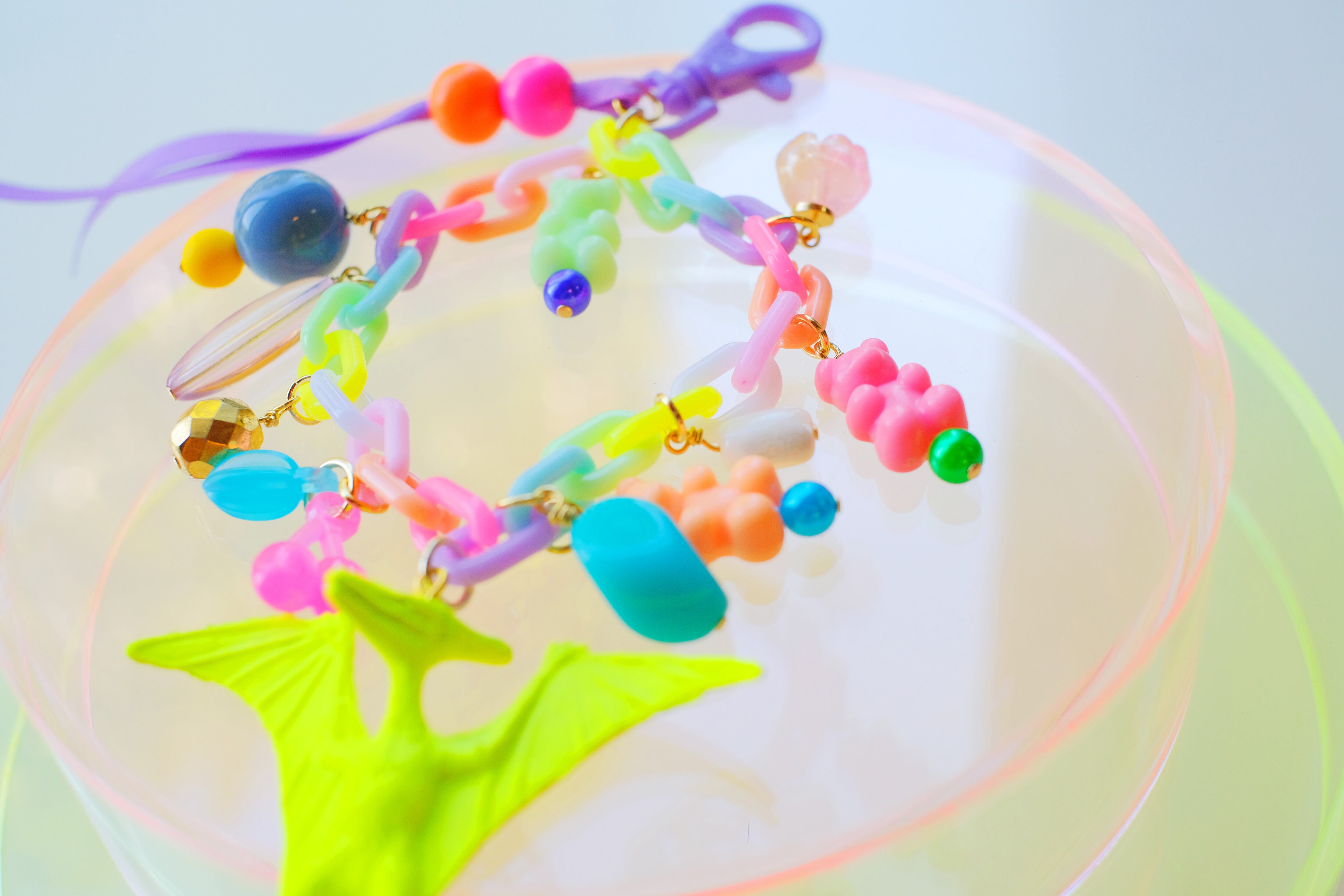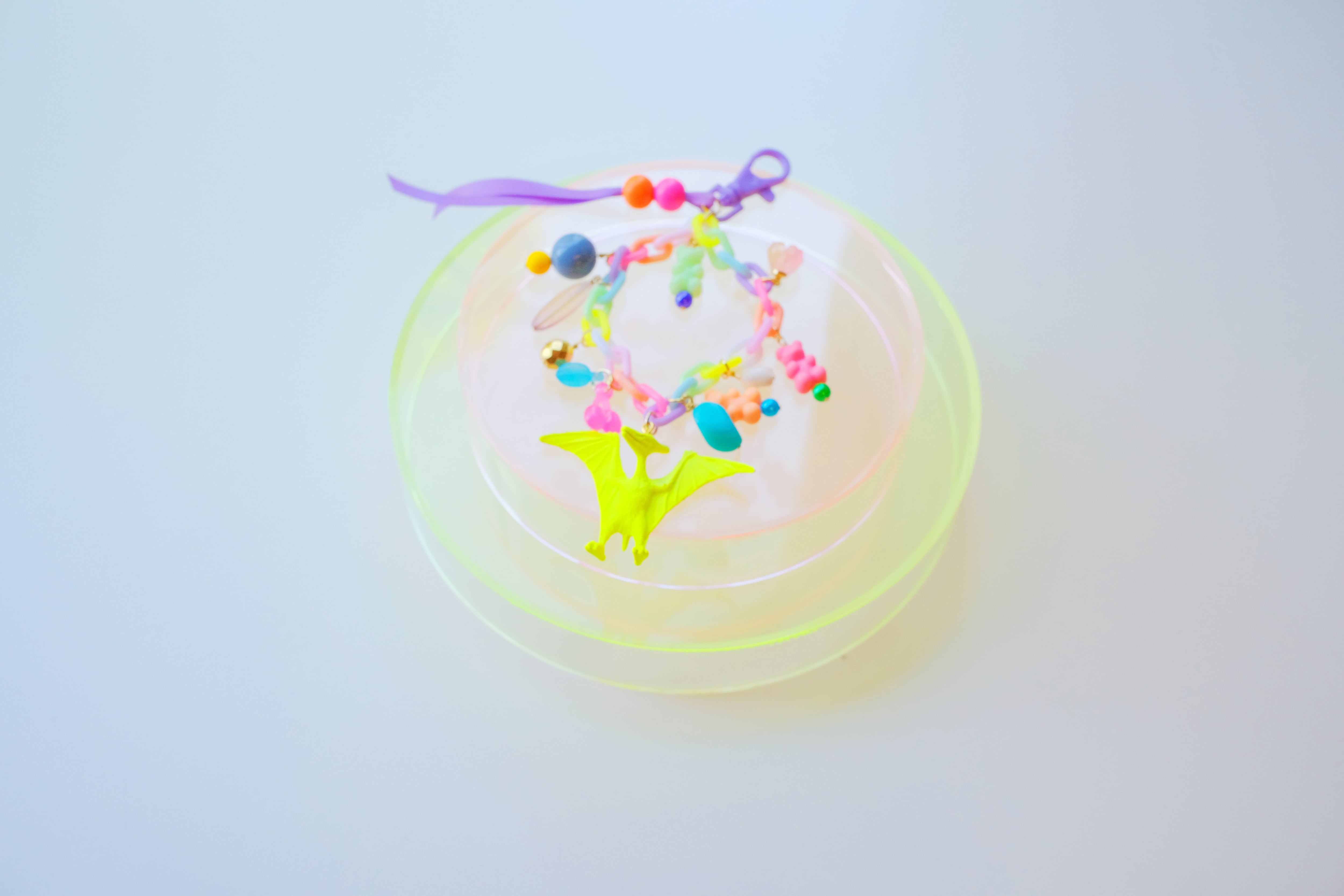 恐竜のミニチュアフィギュアを蛍光カラーで塗装し、グミベアのプラスチックビーズやガラス、宝石、リボン、木製ビーズなどを組み合わせて、