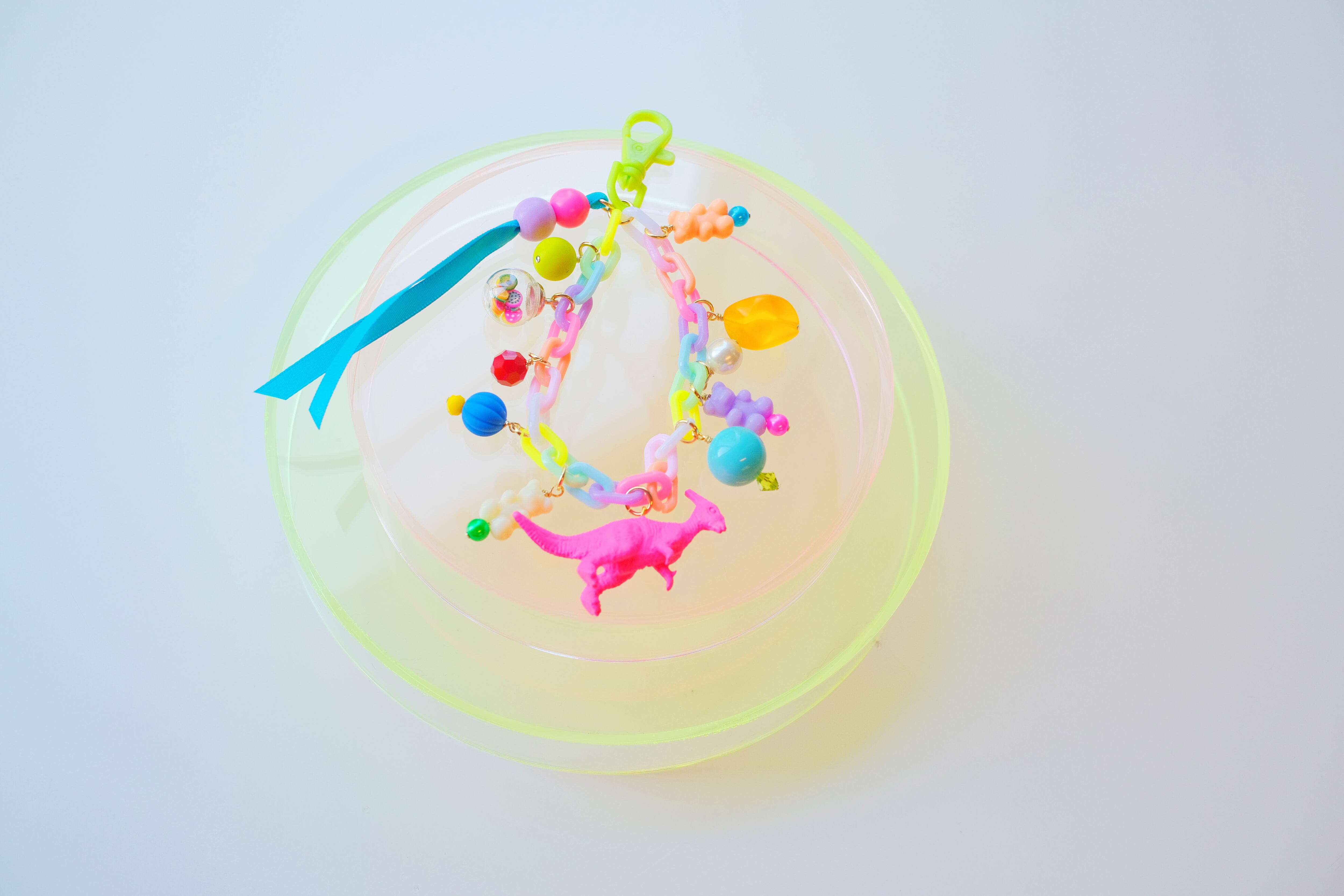 恐竜のミニチュアフィギュアを蛍光カラーで塗装し、グミベアのプラスチックビーズやガラス、宝石、リボン、木製ビーズなどを組み合わせて、