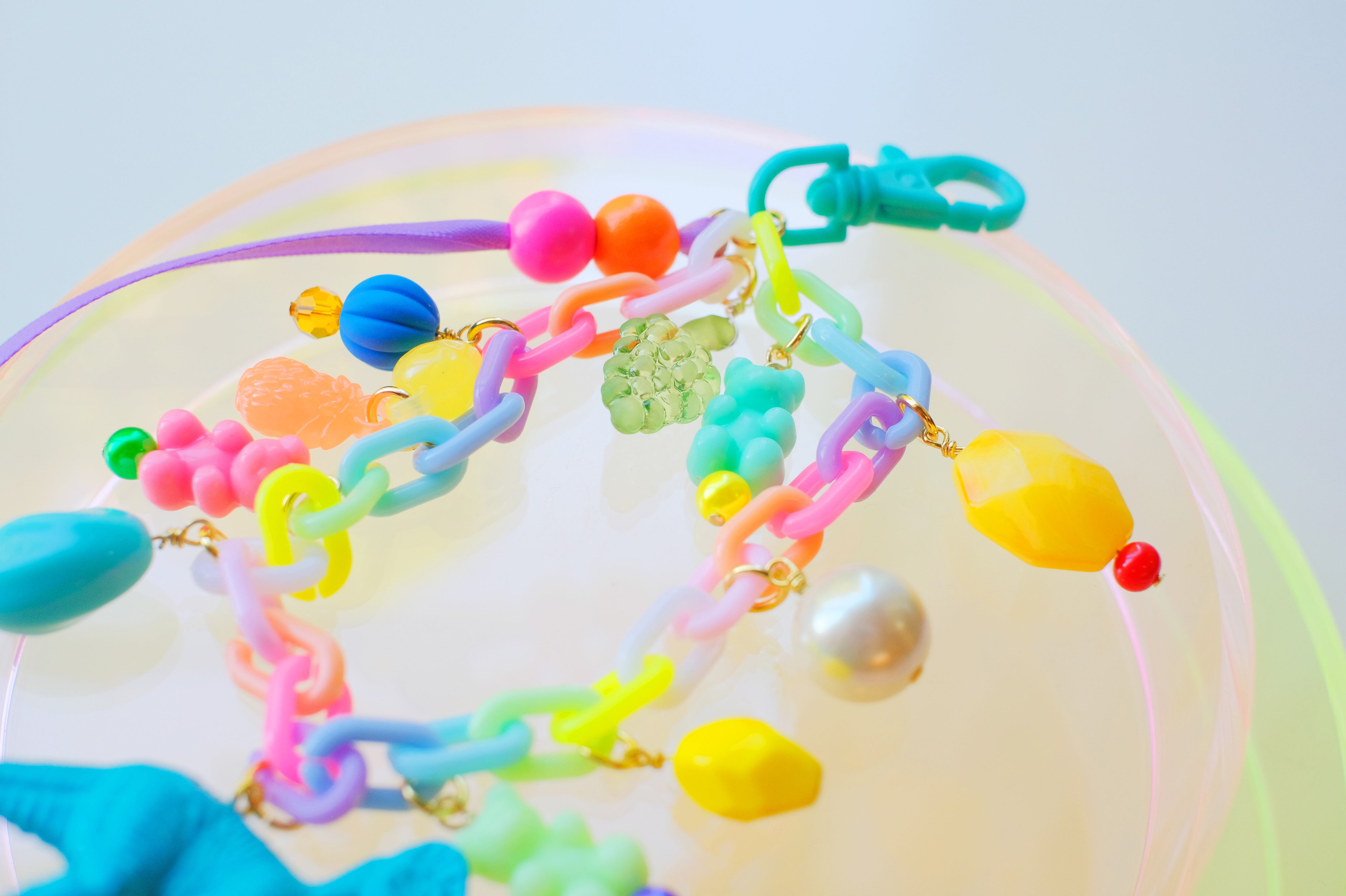 恐竜のミニチュアフィギュアを蛍光カラーで塗装し、グミベアのプラスチックビーズやガラス、宝石、リボン、木製ビーズなどを組み合わせて、