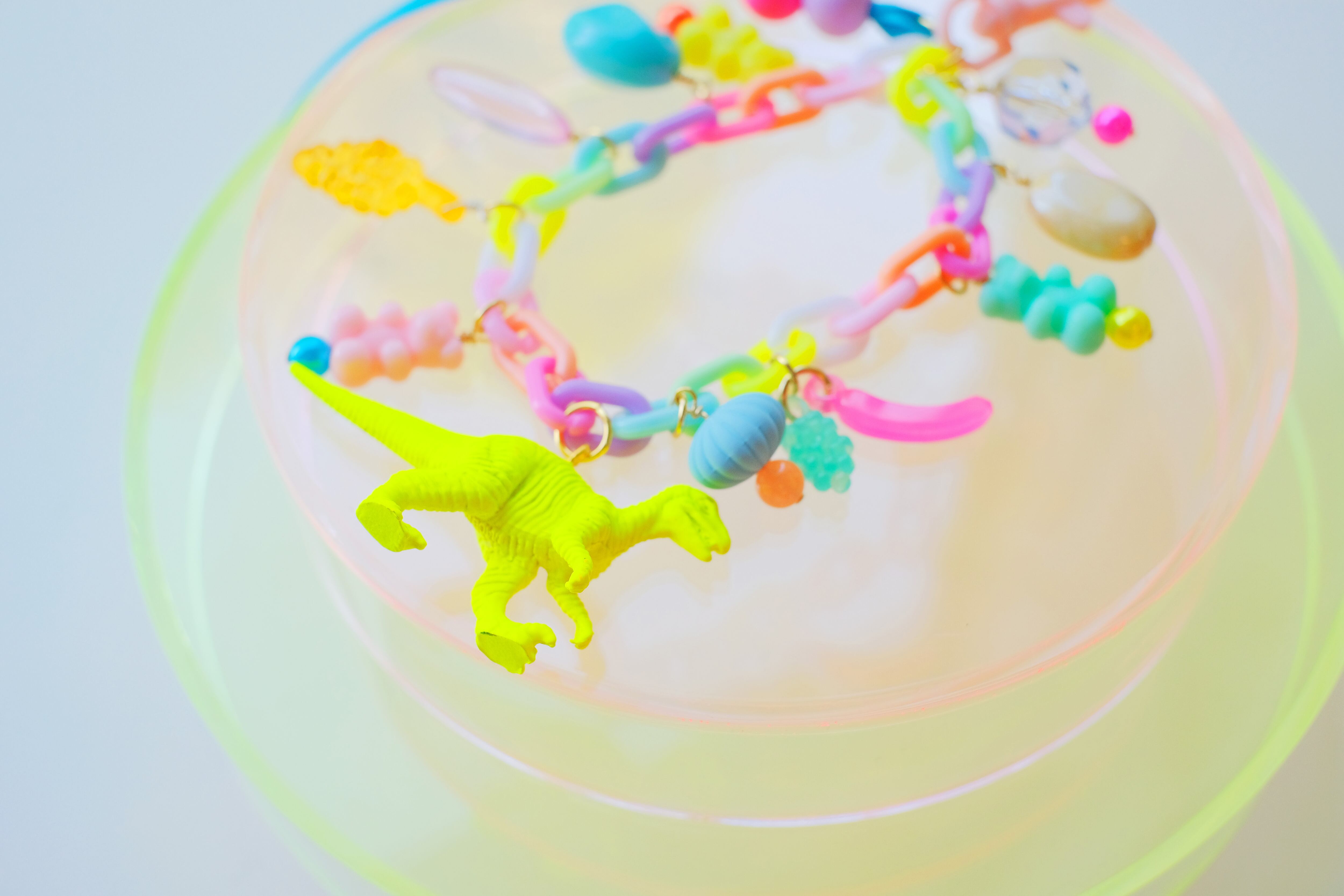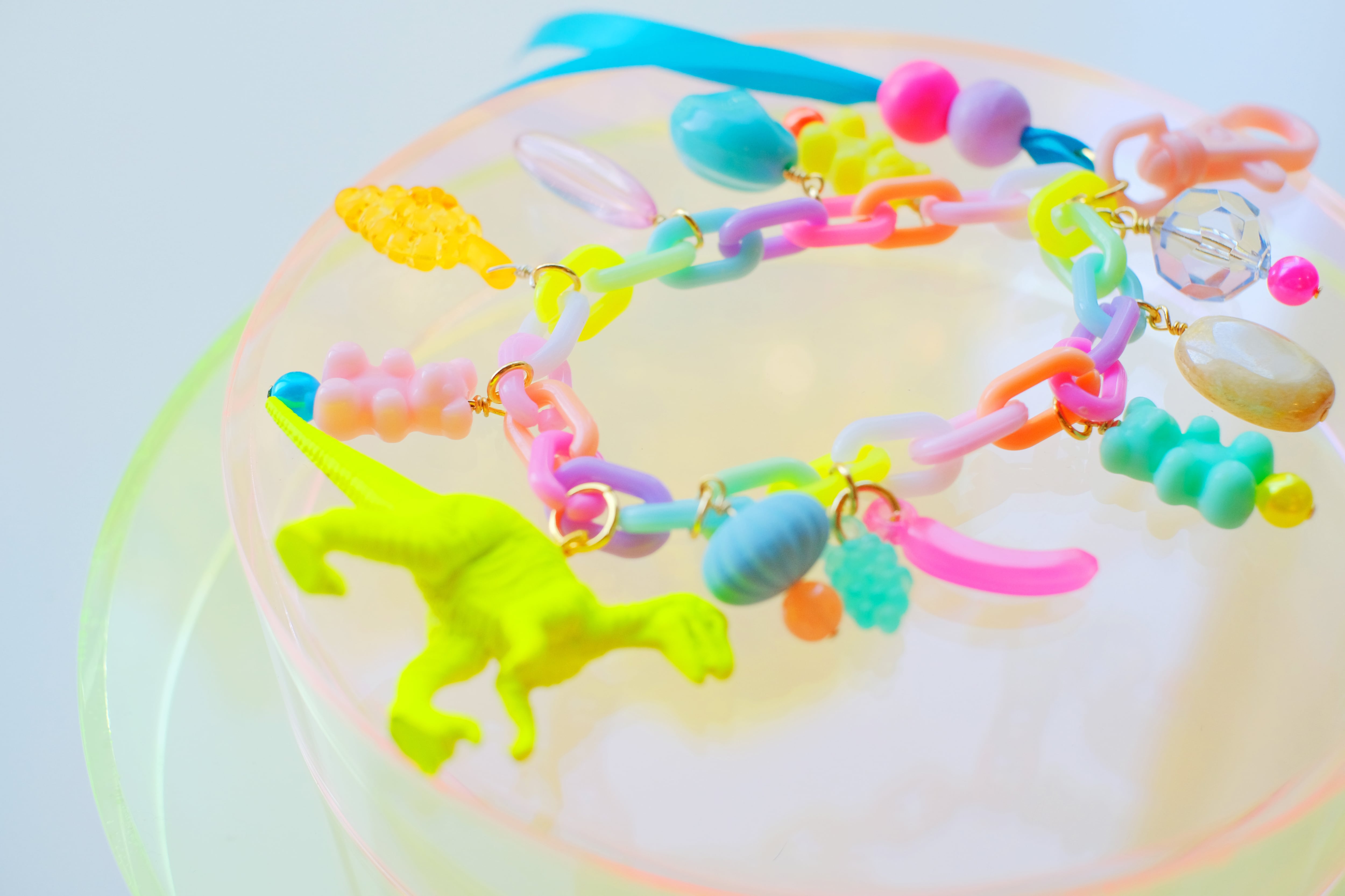 恐竜のミニチュアフィギュアを蛍光カラーで塗装し、グミベアのプラスチックビーズやガラス、宝石、リボン、木製ビーズなどを組み合わせて、
