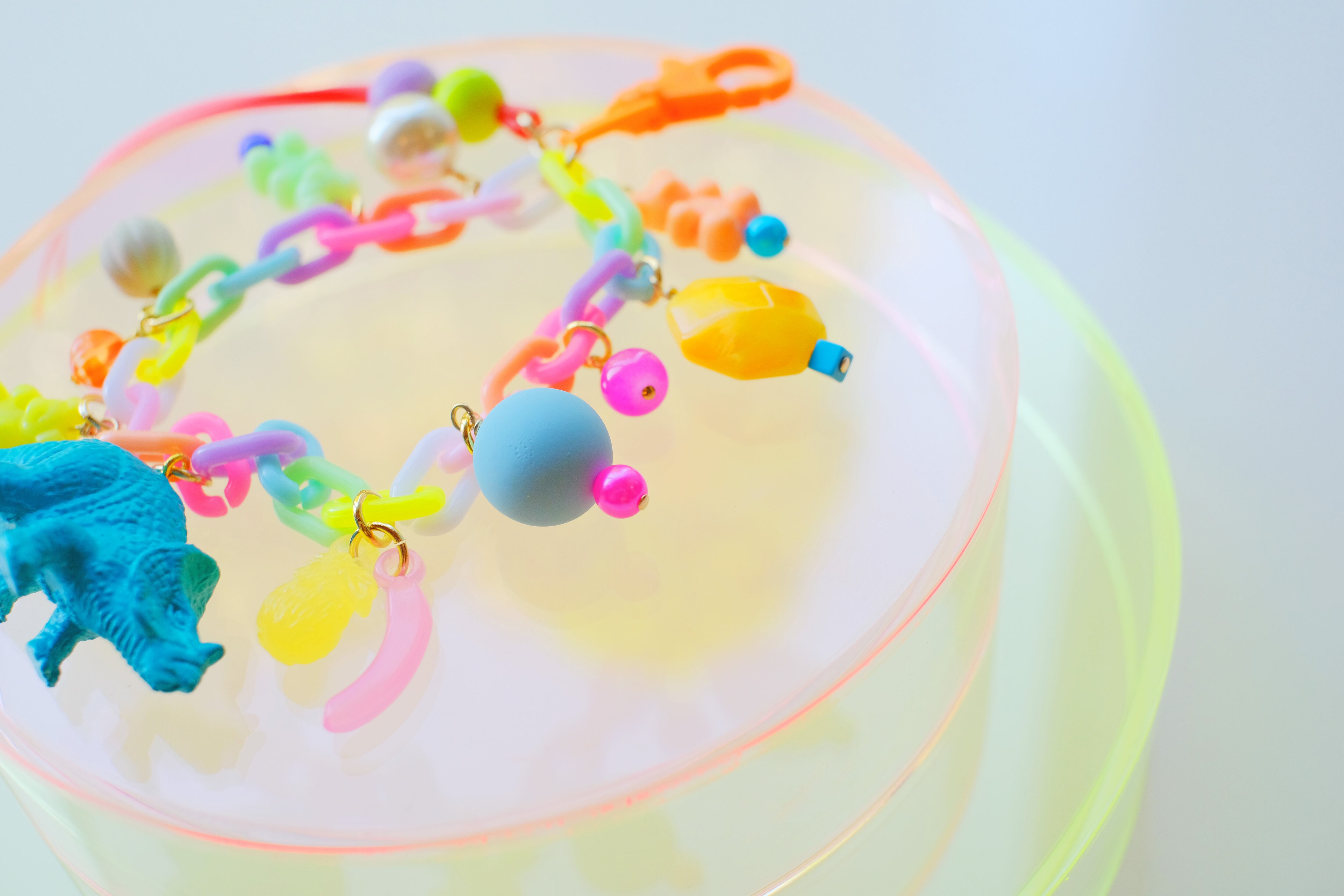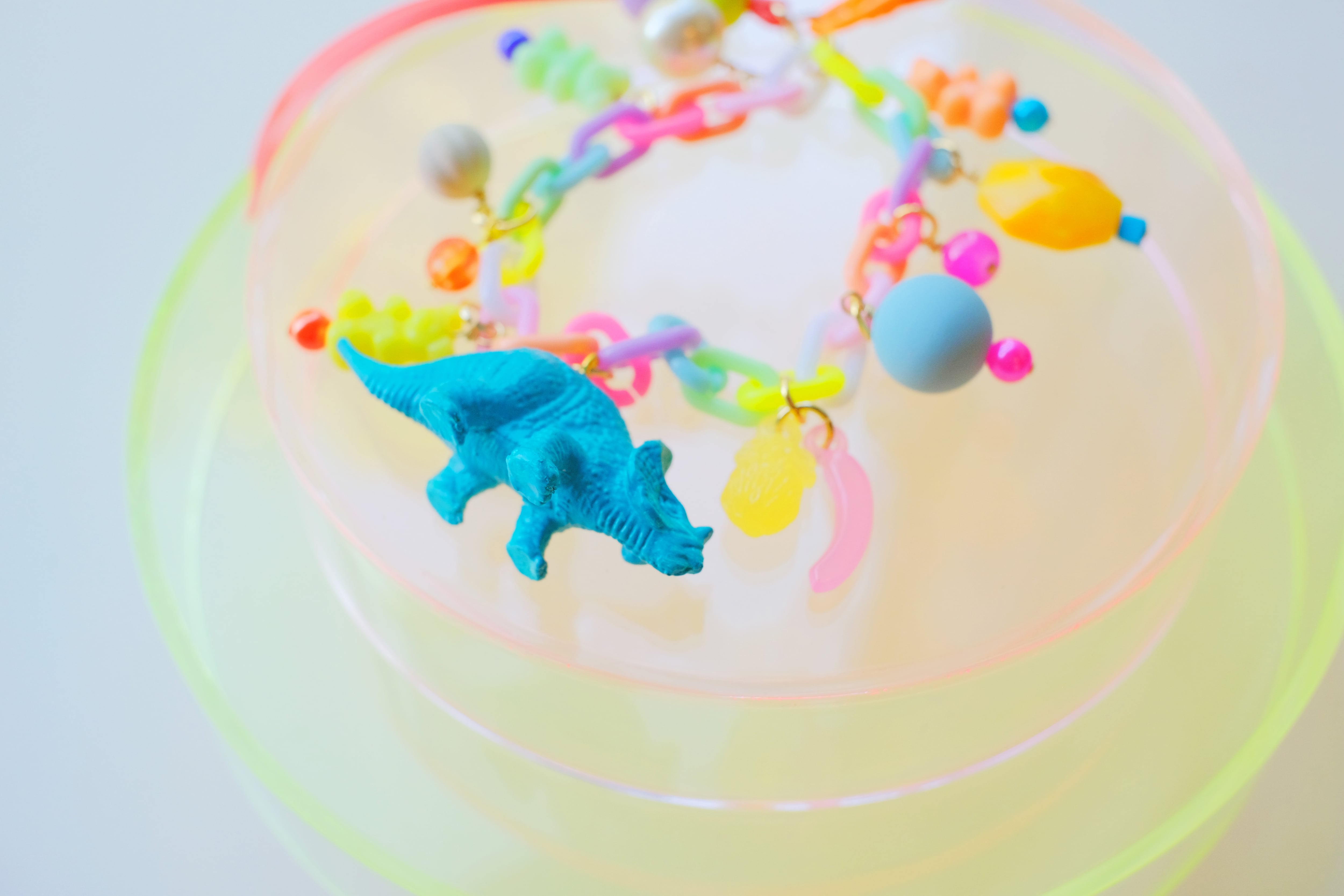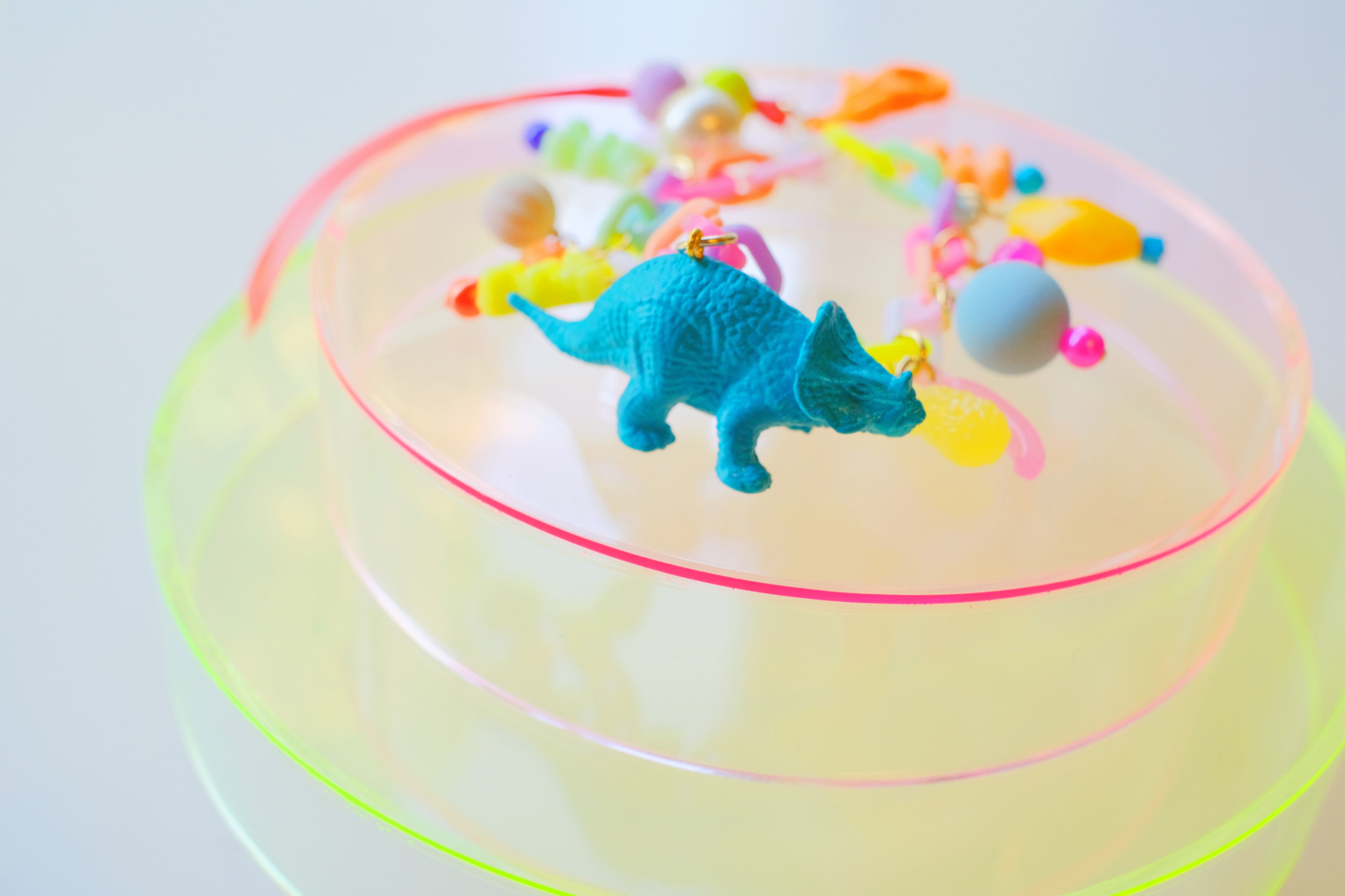 恐竜のミニチュアフィギュアを蛍光カラーで塗装し、グミベアのプラスチックビーズやガラス、コットンパール、宝石、リボン、木製ビーズなどを組み合わせて、