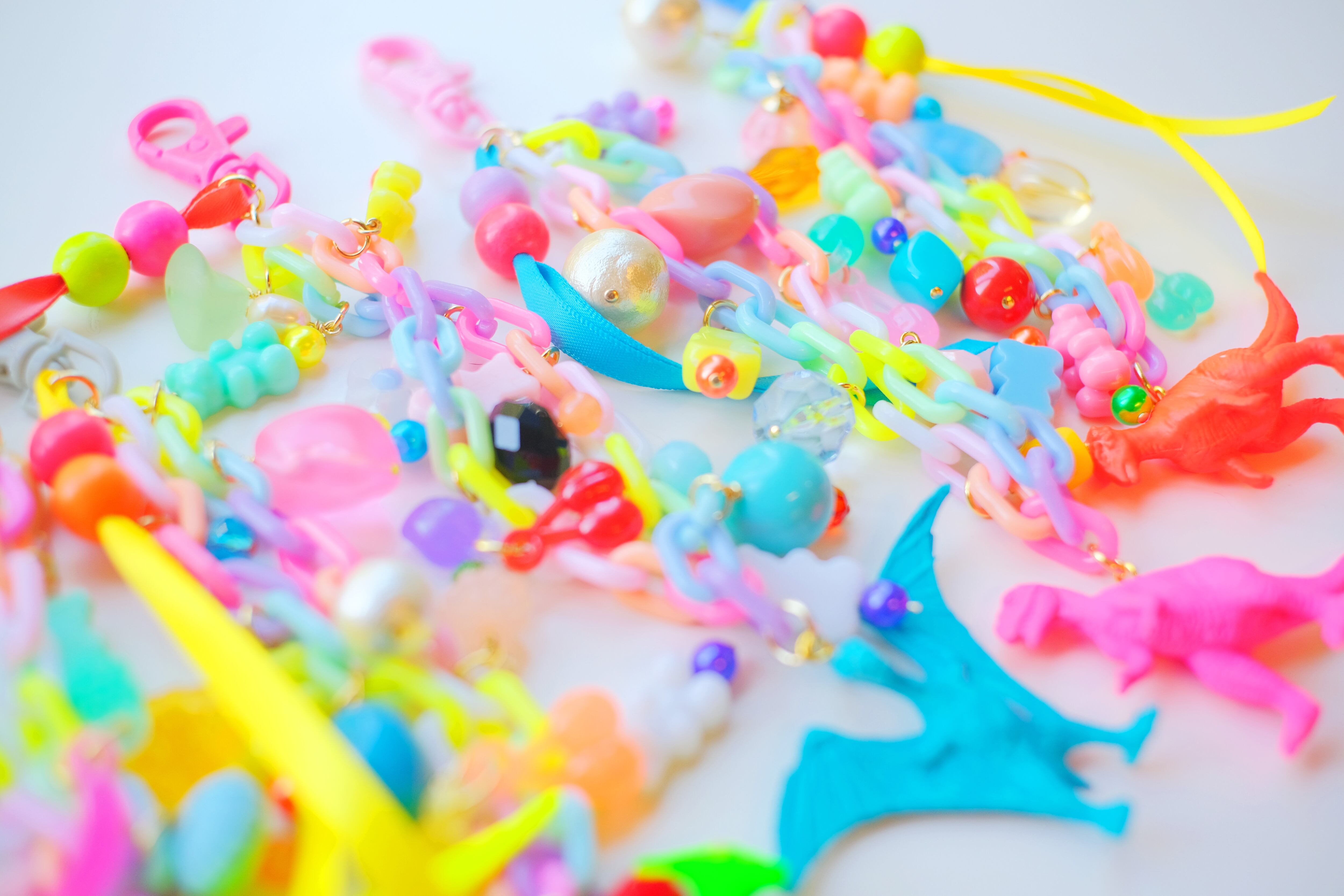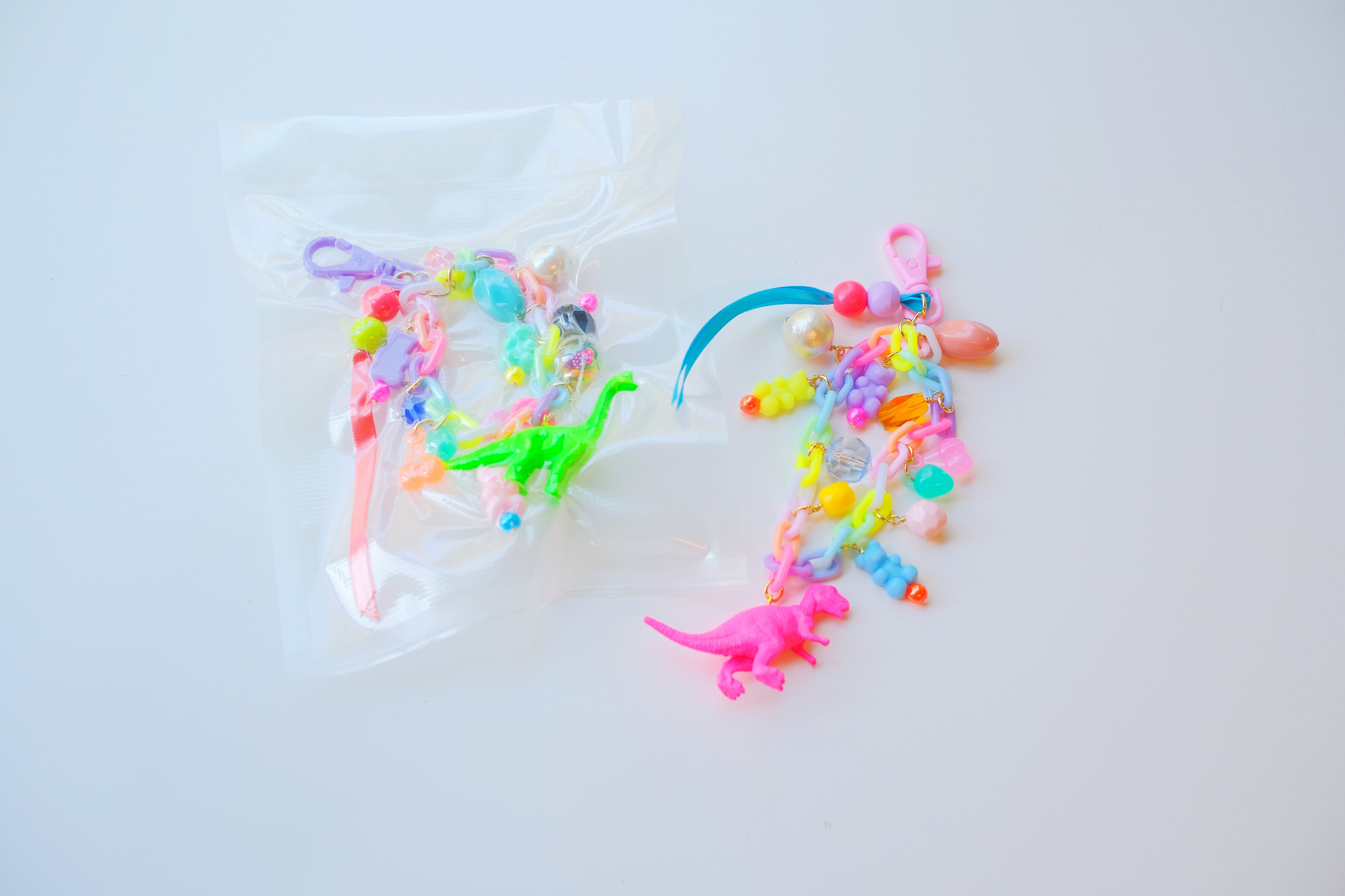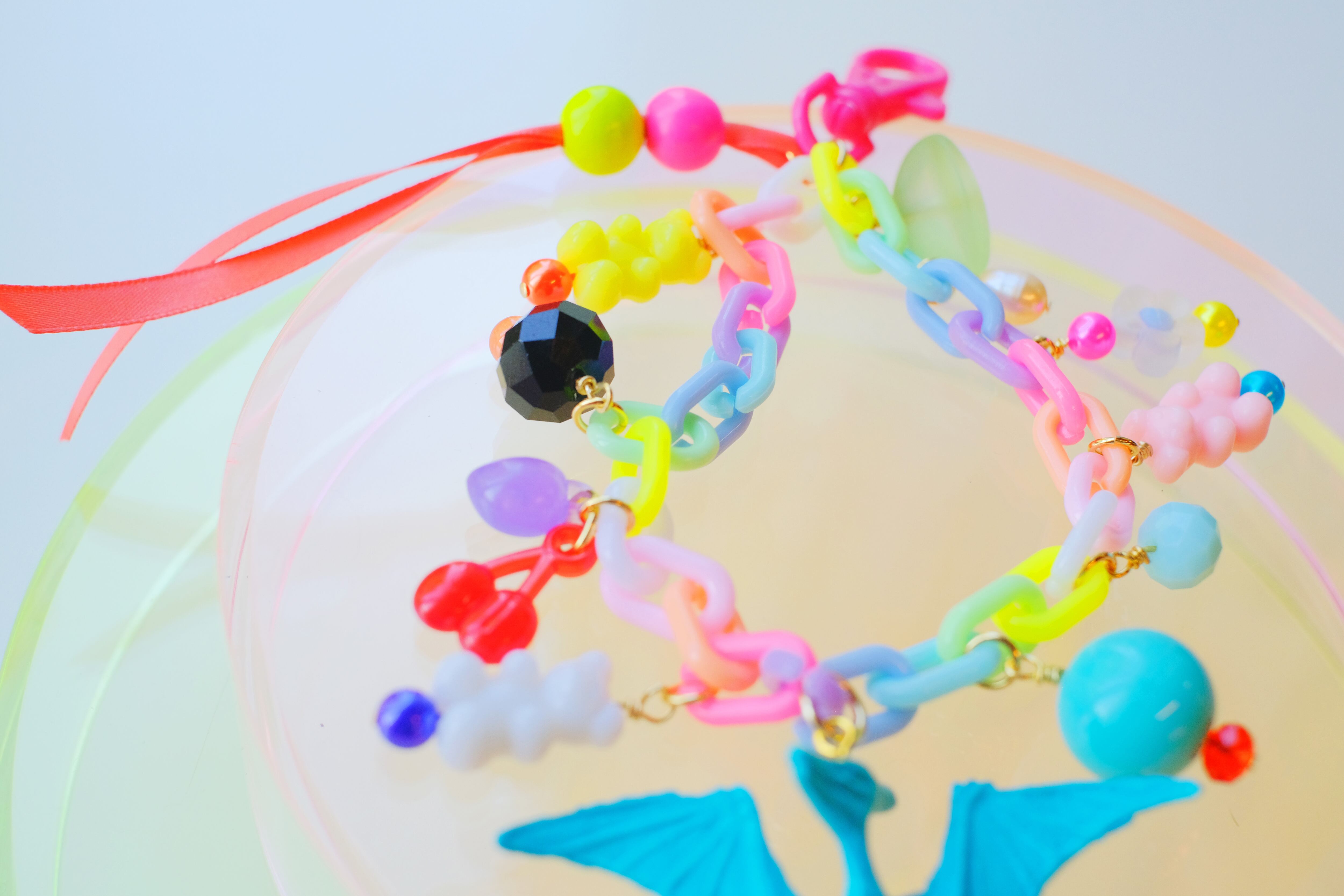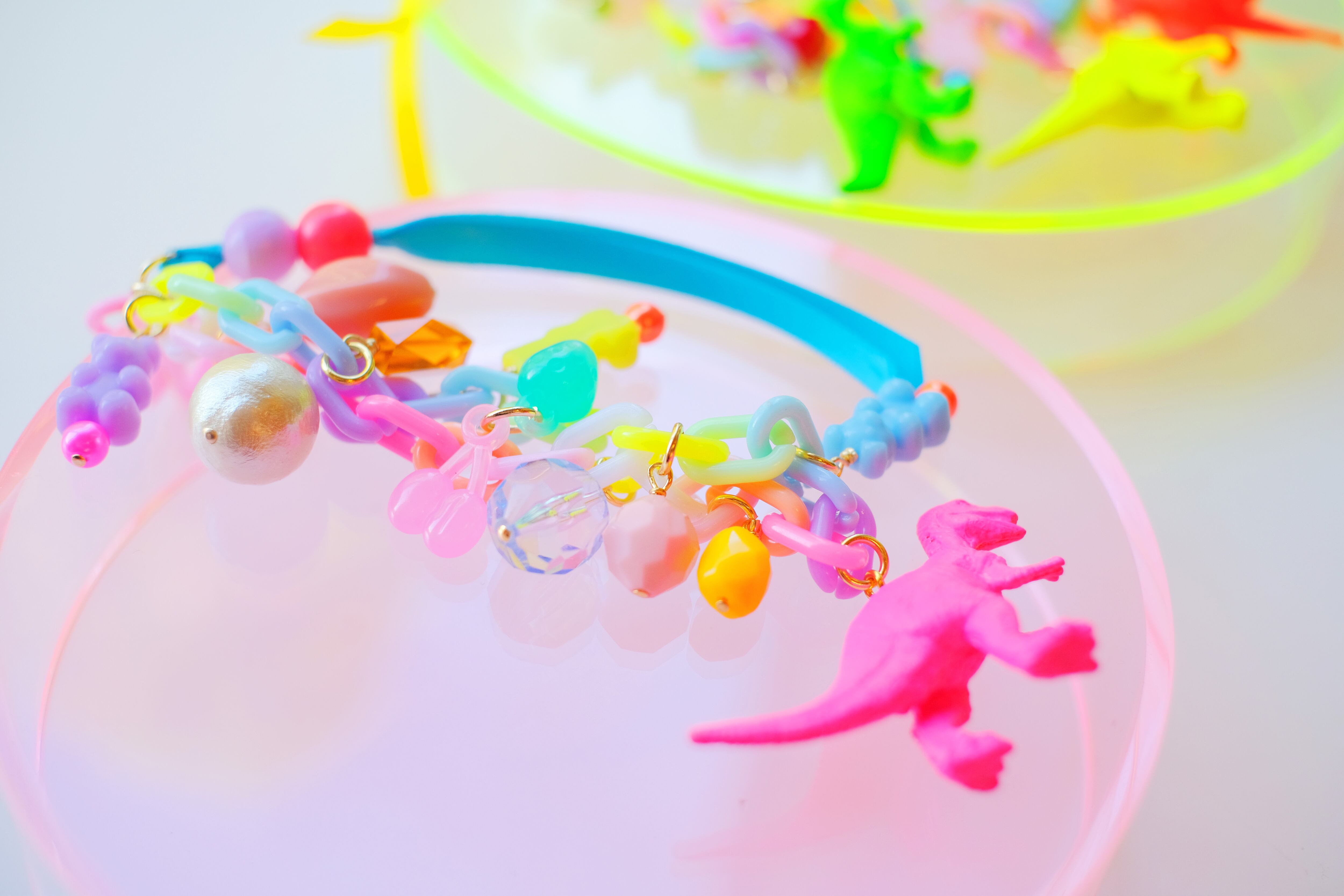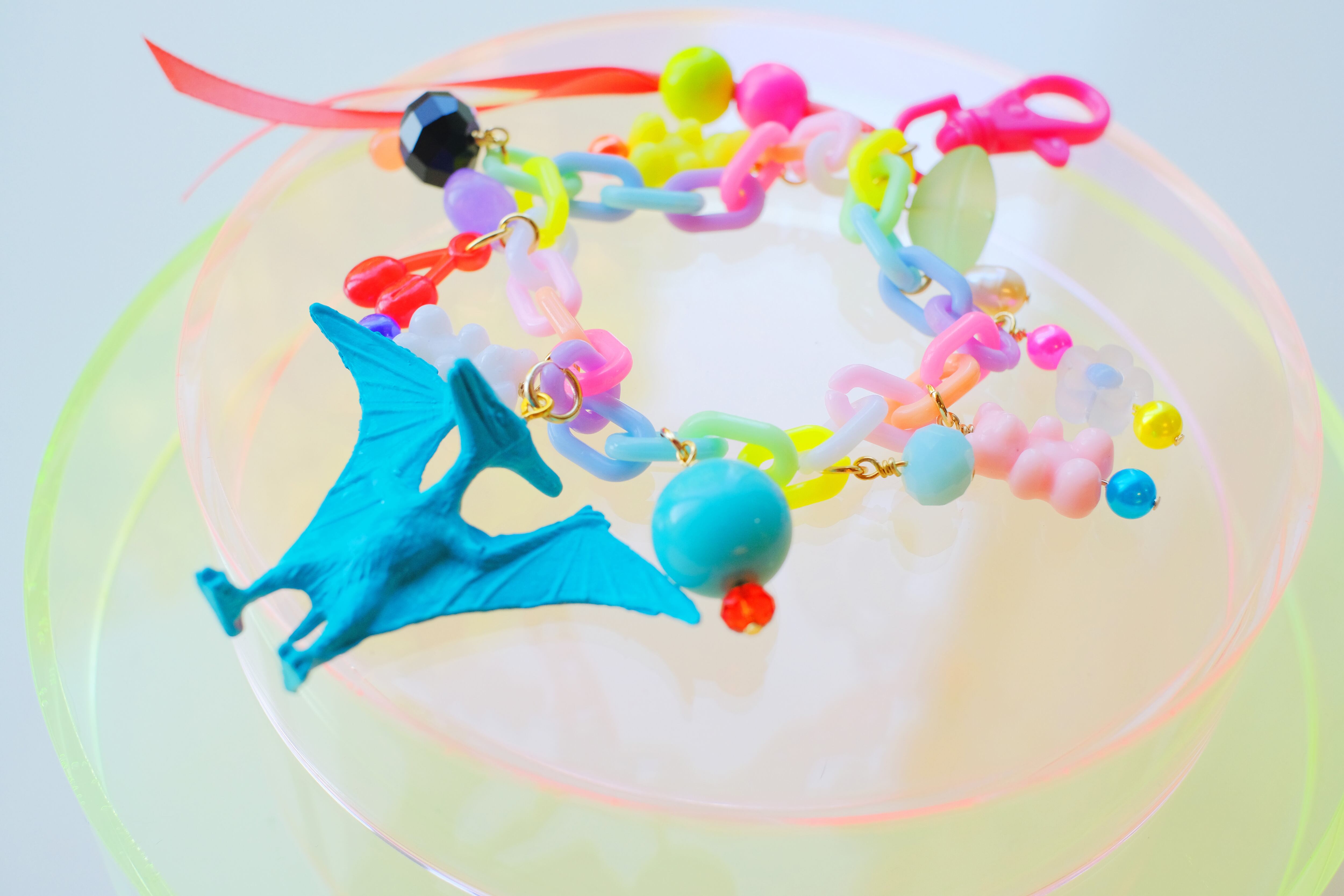 恐竜のミニチュアフィギュアを蛍光カラーで塗装し、グミベアのプラスチックビーズやガラス、宝石、リボン、木製ビーズなどを組み合わせて、